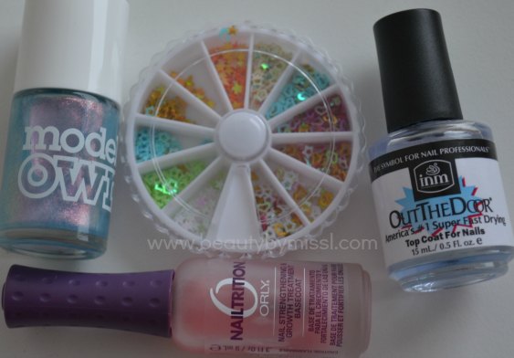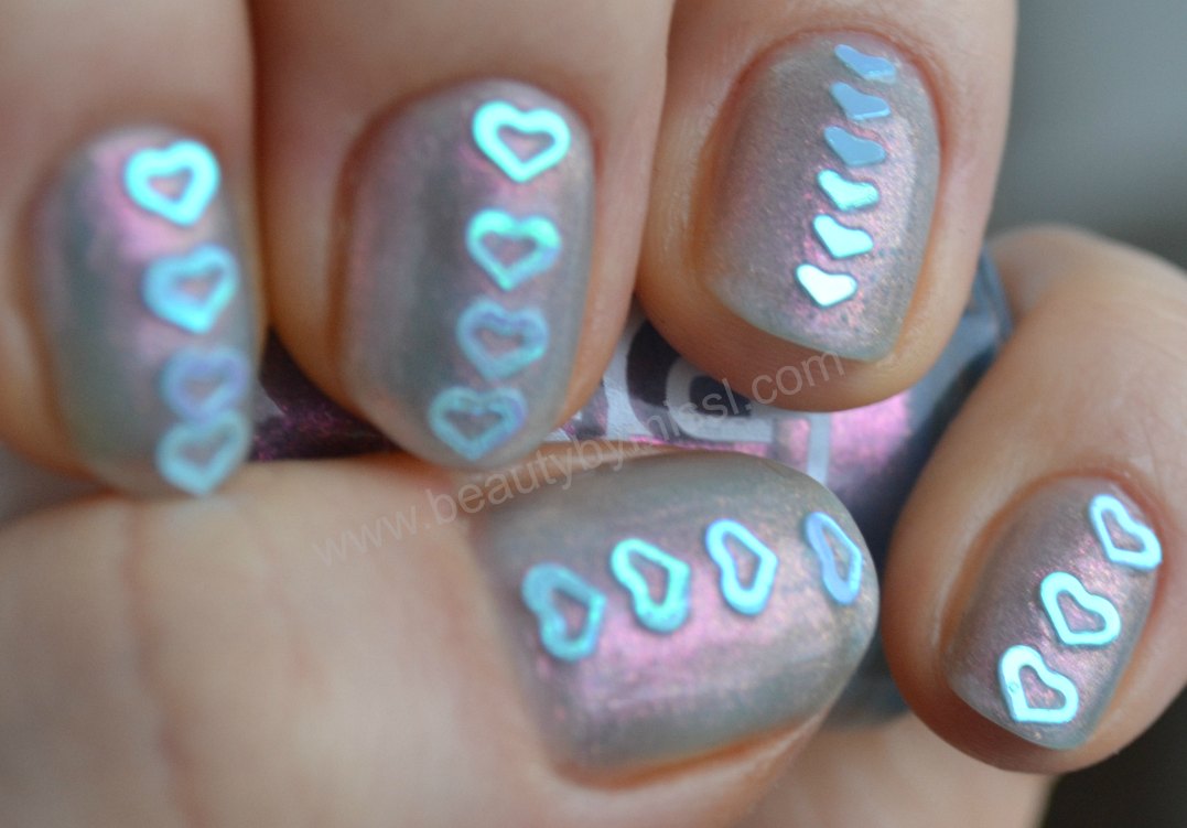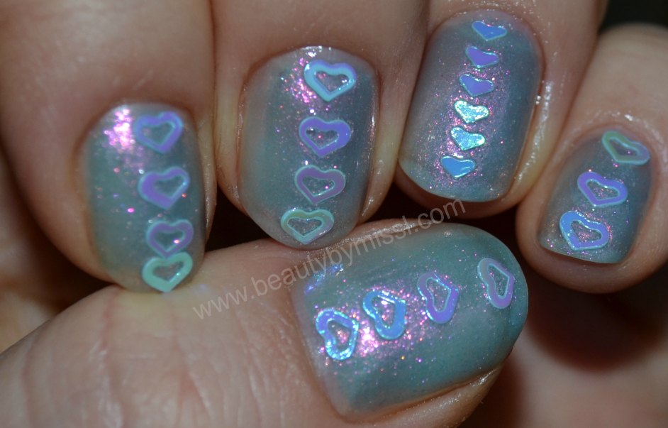 To add little something to Models Own Indian Ocean I decided to use some little blue hearts that I ordered from eBay a year ago. For applying these I first applied clear polish then added hearts and finished the mani with two coats of INM OTD top coat.