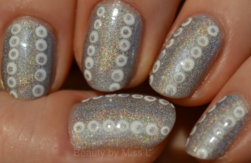 I first applied three coats of Reflecting Silver and then added dots with White on White. When white dots where dry then I added smaller dots with using Reflecting Silver.