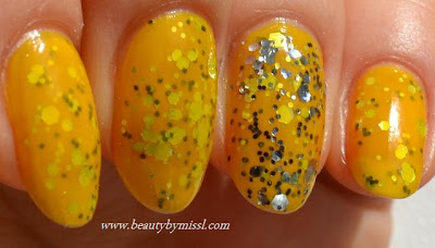 I used 2 coats of Nubar Hot Yellow then added one coat of Funky Fingers Stage Dive and then again one coat of Nubar Hot Yellow. For my accent nail I added one more coat of Funky Fingers Stage Dive.